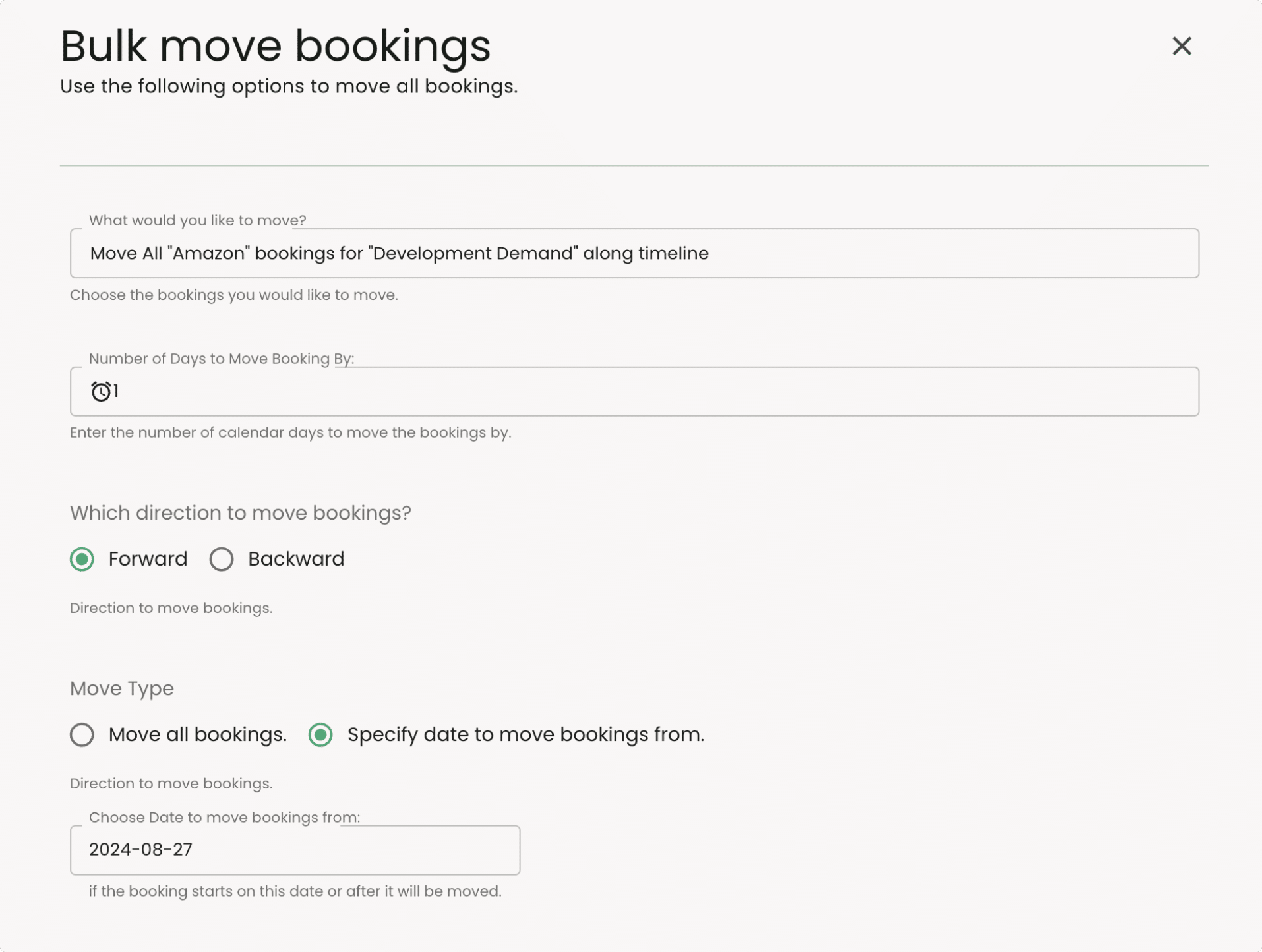 Project Timeline Changes:When a project timeline changes, you can use Multi-Select to adjust multiple bookings at once.