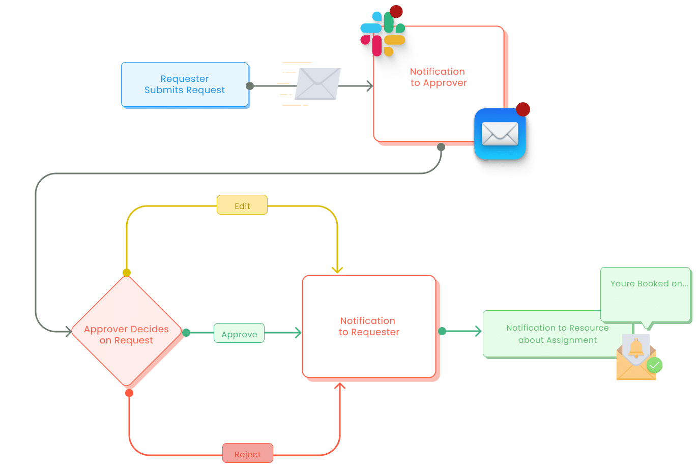 Below we have outlined the new notification flow to keep everyone involved in the loop. By adjusting the notification settings, you can make the communication flow in the way you need for your specific resource request workflow.